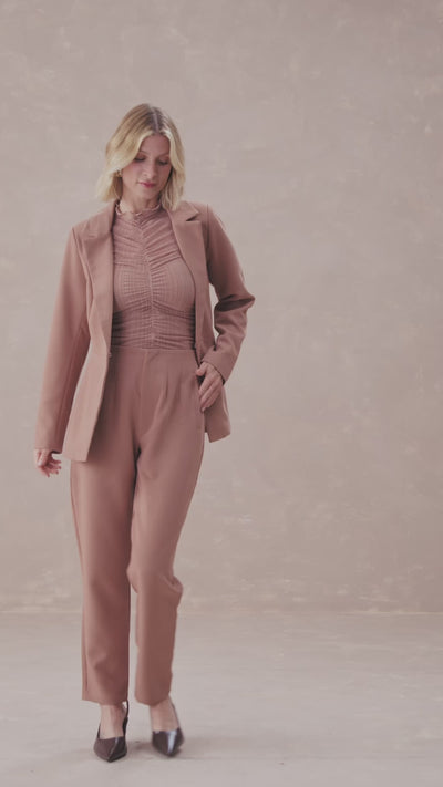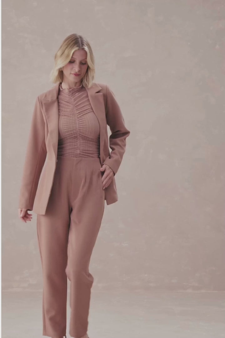 Blazer em alfaiataria com dois bolsos funcionais laterais e fechamento em colchete invisível interno. Possui recortes frontais e nas costas, acrescentando um charme a peça. Curinga para looks office, mas pode ser usado em ocasiões diversas.