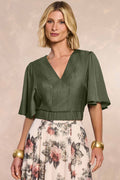 Blusa estilo cropped com mangas amplas e decote v, com recortes frontais e elástico na barra para melhor ajuste ao corpo.