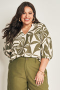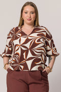 A blusa com manga 3/4 é leve e sofisticada. Seu decote em V e a padronagem geométrica criam um visual moderno e encantador. Ideal para dias de meia-estação com toque de elegância.