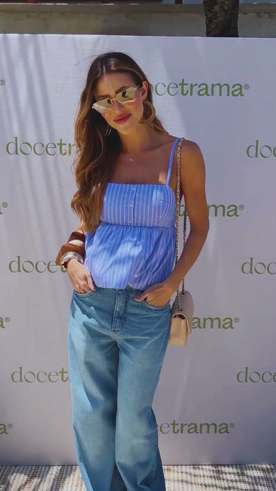 A blusa listrada azul clara é leve, feminina e perfeita para os dias mais quentes. Com alças finas e decote reto, valoriza o colo de forma delicada, enquanto a modelagem soltinha com babado cria movimento e conforto ao vestir. O tecido leve com listras verticais alonga a silhueta e traz um ar fresh ao visual.