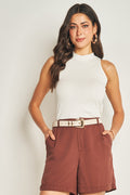 A Blusa sem manga em ribana combina leveza e estilo para o seu dia a dia. O caimento slim valoriza suas curvas de forma natural e o decote gola padre adiciona um charme encantador. Ideal para compor looks versáteis e inspiradores.