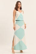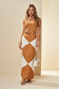 Saia longa com recortes em cor contraste com fendas nas laterais. Peça linda e perfeita para combinar com o top do mesmo estilo. 10% LINHO 34% VISCOSE 56% ALGODAO.