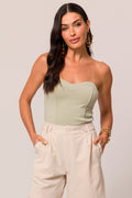 O Top sem alça em malha bodycon destaca sua silhueta com charme e ousadia. A modelagem slim e o decote coração criam um visual jovem e moderno. Ideal para compor looks de verão cheios de atitude.