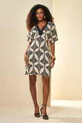 Vestido em tecido texturizado com elastano, todo estampado. Decote com recorte em contraste e viés decorativo, recorte também abaixo do busto para melhor caimento. Mangas amplas e cavas deslocadas. Modelagem evasê na saia do vestido. Tecido com bastante elasticidade.