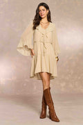 Vestido curto de manga longa com babados na manga e no decote. Possui forro interno, proporcionando mais conforto ao look. Ideal para ocasiões festivas.