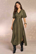 Vestido longo de manga curta com detalhes de pespontos no decote, acompanha cinto em friso com ponteiras. Decote V e com babados na barra frontal, é um vestido leve e fluido.