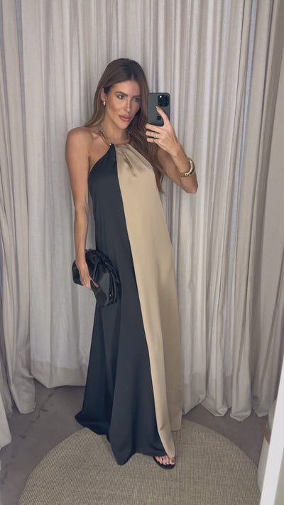 Vestido longo frente única, em tecido cetim plano encorpado não necessitando de forro, e não marca o corpo. Frente com forro somente até o busto para maior conforto. Possui zíper de ajuste lateral para melhor vestibilidade. Decote com gargantilha dourada moderna e regulagem com viés delicado no próprio tecido para ajuste. Recorte frente para contraste. Tecido sem elastano com pouca elasticidade natural.