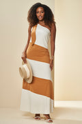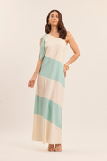 Vestido Longo Oliva de um Ombro Só Listrado