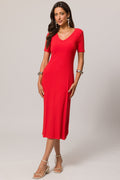 Vestido Midi de Manga Curta em Ribana com Decote V Preço promocional