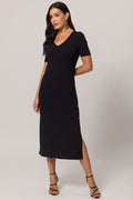 Vestido Midi de Manga Curta em Ribana com Decote V