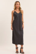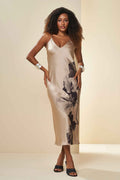 Vestido longo em tecido cetim plano encorpado não necessitando de forro, e não marca o corpo. Não possui zíper de ajuste. Alças finas delicadas no próprio tecido. Estampa frontal localizada e sem toque. Tecido sem elastano com pouca elasticidade natural. Variante preta lisa, sem estampa.