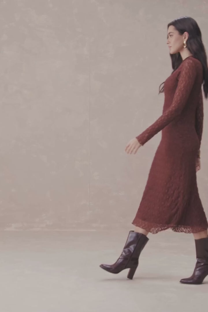 Vestido midi com visual sofisticado e textura delicada que valoria cada detalhe. A modelagem ajustada ao corpo alonga a silhueta, enquanto as mangas longas e a gola alta trazem elegância e equilibrio ao look. A transparência sutil da renda cria um efeito leve e feminino, ideal para produções mais elaboradas.